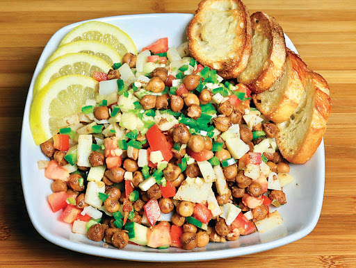 • Green salad, plain or seasoned with fat-free dressing, vinegar, lemon, or any combination of those (no oil) — include greens and raw vegetables like tomato, bell peppers, cucumber, sprouts, radish, onion, cabbage, mushrooms, and celery
